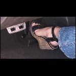 - in jeans, white vest, cowboy hat, high-heeled wedge sandals