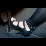 - in black shiny leggings, black-red corset and high-heels
